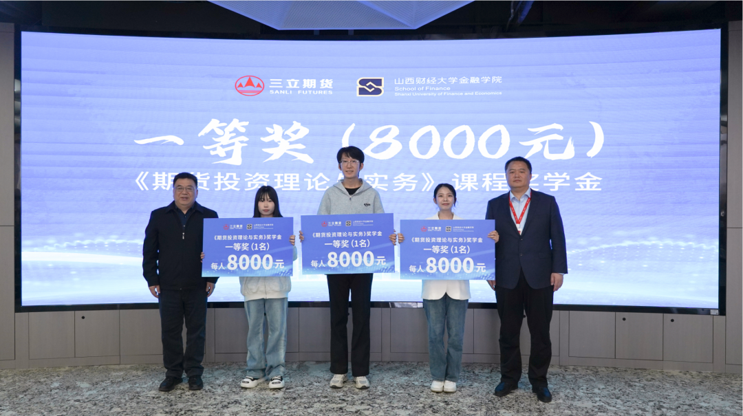 在随后的选修课奖学金颁奖环节,山西财经大学校方领导、学院领导与三立期货高管共同为优秀学子颁发荣誉。本次奖项主要面向选修课优秀学生,奖项设置包括优秀奖、三等奖、二等奖及一等奖。