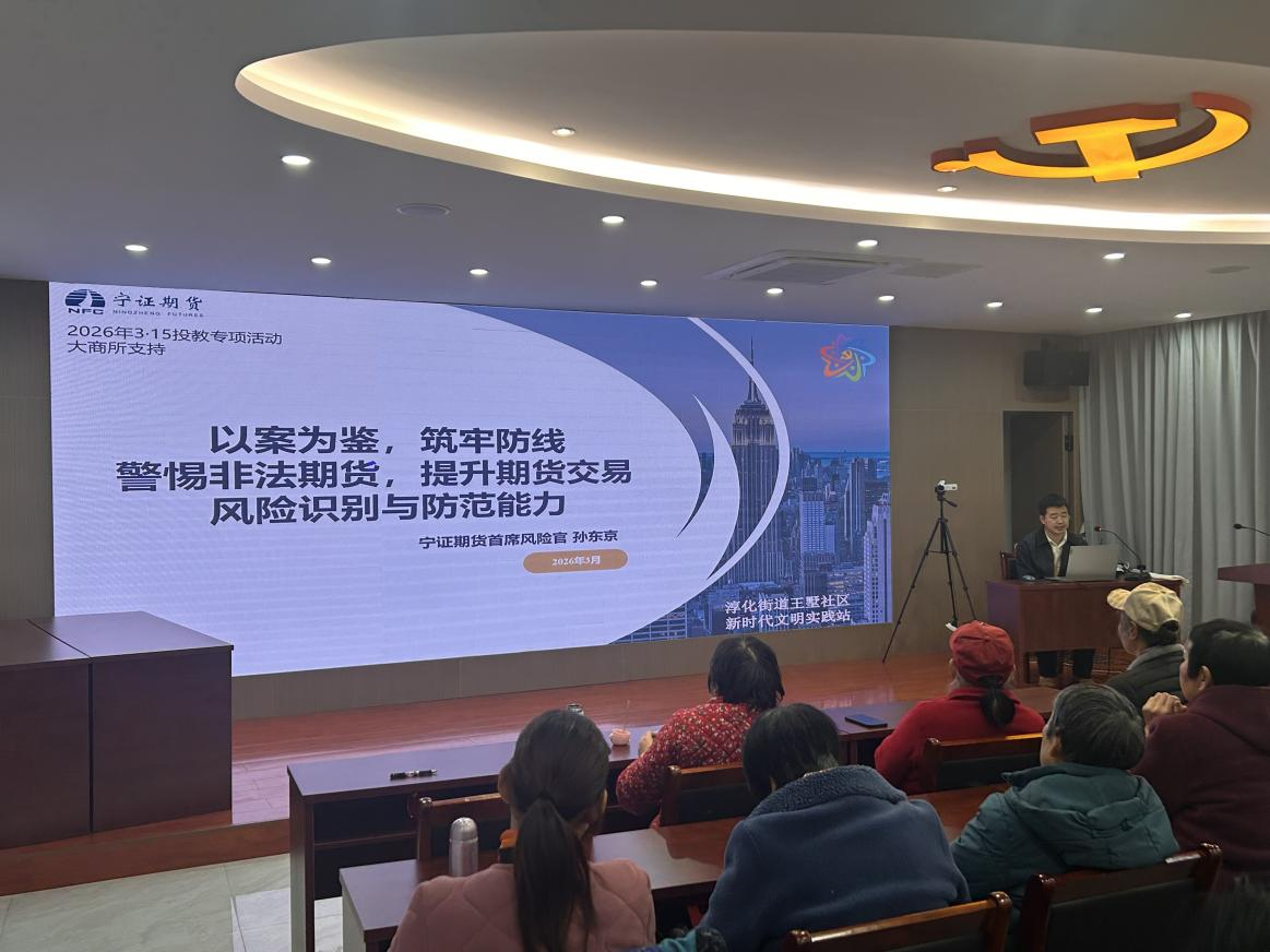 3月17日,在江苏证监局指导下,宁证期货联合大连商品交易所,在江宁区王墅社区成功举办了防范非法金融活动和期货法律知识普及讲座。本次活动聚焦居民金融安全需求,通过法律法规解读、典型案例警示、风险防范提示等形式,为社区群众送上一堂生动实用的金融安全课,切实提升居民风险识别与自我保护能力。